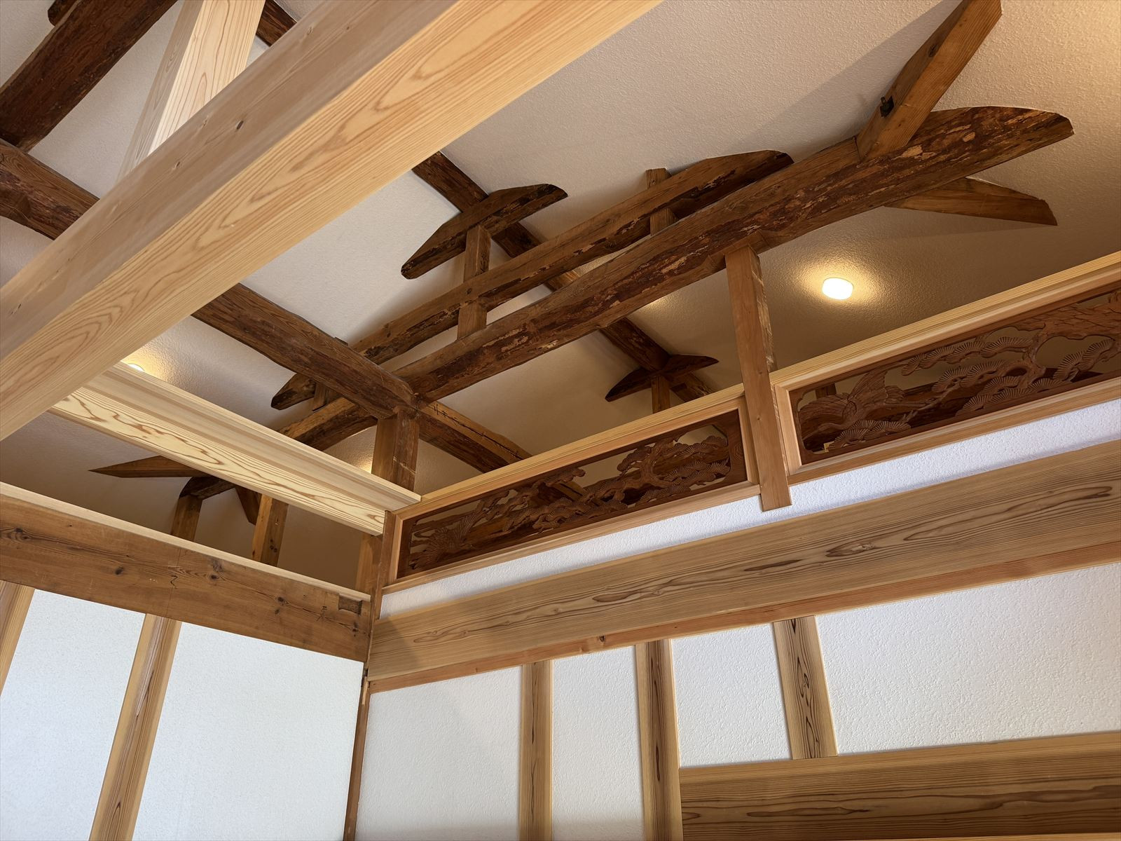 らんまも再利用 ※昔の梁や柱は、1本づつ水洗いされたそうで、とてもきれいな木材で味のある色でした