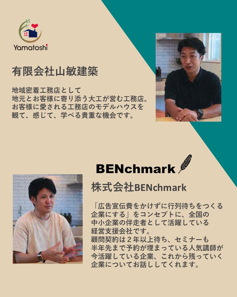また、今回は全国の中小企業の伴走者として活躍される株式会社BENchmark様もお招きしてのセミナーになります。株式会社BENchmark様は経営支援の会社になるのですが、「いかにお金をかけずにお客様に愛される企業になるか」を提唱している会社で、その指南を受けるために最短でも2年待つ必要がある人気の経営支援会社になります。セミナー講師としても半年以上予約が埋まっている講師をお招きして「今活躍している企業、これから活躍している企業」についてお話ししていただきます。今回のセミナーはつづくとお取引をしていなくても「良い家を建てたい」という想いがある住宅会社様であればどなたでも参加いただけるセミナーになります。ただ、会場の都合上参加出来る数に限りがございますので、ご興味がある方は是非つづくのホームページのお問合わせからご予約ください。